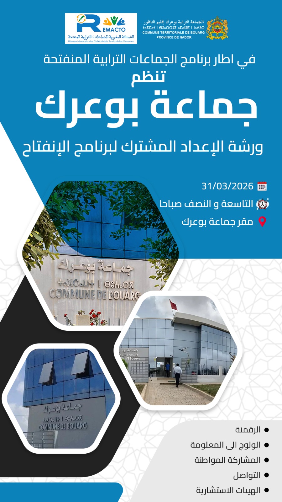 جماعة بوعرك تنظم ورشة الإعداد المشترك لبرنامج الانفتاح في إطار الجماعات الترابية المنفتحة